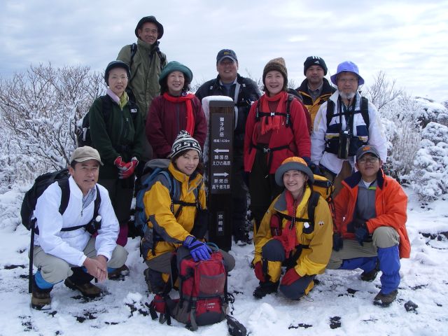 | 早朝出発時、雨交じりの天気が嘘のような展開、山頂からの展望、おまけの雪景色、登山の感動をしっかり堪能させていただきました。道中では前回同様の鹿児島お笑いグループ!?突っ込みとボケのコラボレーション抜群のお姉様漫才で、元気を貰い全員完走!!! 皆さんお疲れさんでした。他県から参加のOさん、Sさん、また何処かでお会いしましょう。