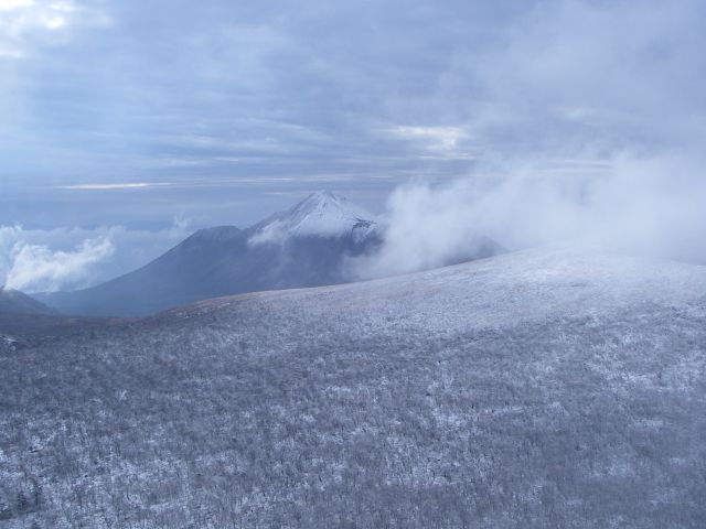 前日、前々日と暴風雨。当日の朝5時10分小雨!天気予報の晴れを信じてまだ暗い中、自宅を出発。 新湯の駐車場で準備・挨拶を済ませ7時00出発。林道歩き早い・・・こんなに急ぐの? 50分で川の所まで、使用前と称する記念撮影(もちろん本物の笑顔) 程なくすると韓国岳の雪化粧が見える。汗かいてる自分達の状況とはかけ離れている為いいねぇ−と他人事!が、歩いていくうち自分達の足元にもちらほら雪が積もっている 地面がうっすら隠れるくらい 歩くとふわふわする位 一面銀世界 と刻々変化する 初めて〜 みつばつつじのトンネルになる所が一面雪!トップを歩いていたので新雪に足跡を残せる贅沢後ろを振り返って見るほど感激でした。 新燃岳のウサキの耳も白い帽子を被り、高千穂は富士山の様。最高〜!! 雪山には行った事なかったのに思いがけず体験できました。 大幡山の山頂に誰か雪だるまを作っていましたヨ 丸岡山、夷守岳には全く雪はなくまたまた汗だくで登りました。なんと変化のある山行。 帰りの景色は朝の雪は溶け大幡山の雪だるまも無く夢の世界から現実へ・・・10時間30分よく歩きました。お疲れ様でした。運転して頂いた早坂さん、いいタイミングで企画して頂いたリーダーほんとうにありがとうございました。感謝します | ||