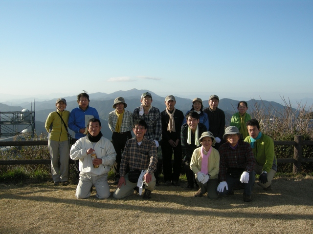 頂上から市の瀬峠へとなだらかに下り、建郷山に向けてグンと登りかえした後は、小規模のアップ・ダウンが連なる尺岳への九州自然歩道を辿りました。途中で古賀さんから熱々のコーヒーの差し入れを受け、激励に感謝しつつ、ネジを巻き直しました。 スタートから6時間も歩き続けて、尺岳平でやっと昼食となりました。おにぎりを頬張りながら、「未だ半分」と30kmの縦走路の長さをずっしりと受け止めつつも、「半分歩いた・あと半分」と気分を切り替えました。 坂井リーダーの牽引力がつくった40分の貯金を、金澤さんが引き継ぎ、「下り・平地は歩幅を広げて足早に、上り・難所は歩幅を縮めてゆっくりと」との、減り張りの効いた歩きでひたすら南下し、無事、雄大な福智山を越えました。 最後の頑張りどころの赤牟田の辻(念仏坂)は、スキーのジャンプ台を見上げているような気持ちになる急斜面。越えるしかないと覚悟をきめて、ヨイショ・ヨイショのかけ声で一歩一歩登って行ったのですが、頂上間近では、声を出す度にお腹の空気が抜け、足が動かなくなったので、口だけパクパクさせていました。頂上から縦走路を振り返ると、福智山の美しい山容だけでなく、なんと、見覚えのある電波塔を頭に載せた皿倉山が遠望できました。「まあー、よく遙々歩いて来たもんだ!」と感激の瞬間でした。 ここまで来れば、あとは牛斬山に立ち寄って降りるだけですが、日没の時刻も気になってきます。キャップライト下での下りは危険が伴うはずです。ここで、坂井リーダーの貯金と金澤さんの好リードが物を言い、日没前に、余裕を持ってのJR採銅所駅に到着となりました。リベンジ縦走を目指す寺井さんは、以前の墜落事故での後遺症が今回もまた再発し苦しそうでしたが、武藤リーダーの援護の下、予定時間通りの到着となりました。 不安と期待に緊張しながらの参加でしたが、転倒することもなく(滑りはしましたが)歩き通せました。皆さん、お世話になりました。有り難うございました。 | ||