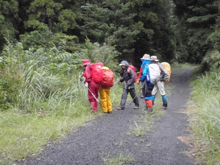 ![]() 歩き始めてまもなくザーッと土砂降り、急いで合羽に着替える。 まもなく止んで暑くなり脱いだ。幸い、後は下りかけるまで降らず。 Photo by Furukawa |