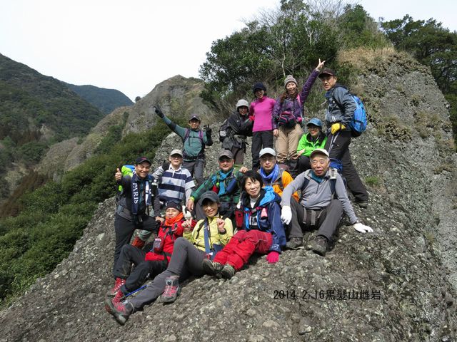 参加者の皆様お疲れ様でした。 雑誌で見ていたときからずっと行きたかった念願の黒髪山に行けて嬉しかったですー。痩せ尾根や絶壁がすごかったですね、山頂の爽快感も最高でしたー、下を見ても何もない絶壁に腰かけてのお昼ご飯もなんというシチュエーション!最高に気持ちよかったです☆ しかし、下りとなると楽しさ一転、たくさんの岩や石の上を歩かなければいけない事もあり、岩肌のツルツルした感じが苦手で苦労しました、いろいろと助言いただいた皆様ありがとうございました。下りではいつもご迷惑おかけしますがこれからも精進していきます。 しかし、憧れの山に登れて、雌岩、雄岩もみることができ、楽しい一日でした? 武藤リーダーを始め参加者の皆様ありがとうございました、また次の山で会いましょう〜。 | ||