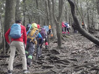 参加の皆様、お疲れさまでした。 今回の東神社コース、やはり登りがいがありますね。最後の山頂直下の急坂は疲れもピークになるところで、ここではいつもきつく感じます。初めての方もリピーターの方も、登山の楽しみ(苦しみ?)をあらためて感じられたのではないでしょうか? それでも、先頭歩きの福りリーダーのペース配分もよろしく、二子石、山頂ともほぼ予定時間で登ることができ、昨年のリベンジも達成できました! 曇り空ながら、山頂からの見通しは意外と良く、新燃岳などの霧島連山や、雲上に浮かぶ市房山などの球磨三山の姿も目にすることができました。季節と天候により山は常に違った様子を見せてくれます。これも登山の楽しみだろうと思います。何回登っても飽きません。 山頂近くのイワカガミも健在のようでした。もうしばらくしたらピンクの可憐な姿を見せてくれるでしょう! 今回も車ボランティアなど多くの皆様のご協力で、少しハプニングも有りましたが(^_^;) 、無事に楽しい一日を過ごせました。遠方からご参加の方は帰りの都合で温泉にご一緒できなかったのは残念でしたが、またどこかの山でご一緒しましょう! (ps)鹿児島会には和歌を詠むベテラン会員さんがいますが、今回俳句を詠む会員さんも登場されたよう! 今後も楽しみです。 | ||