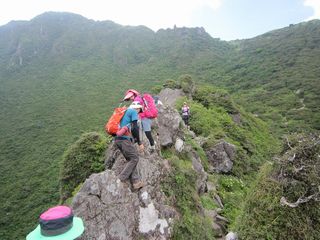 参加の皆様、御世話になりました。 真夏の由布岳は初めてで、暑さに対する心の準備はしていましたが、やはり暑かったです。 しかし時折吹く風と、冷たくて美味しい差し入れのおかげで生き返りました。 ありがとうございます。 昨日はお肌の紫外線対策を怠り、顔面と手の甲が真っ赤です。 お鉢周りのような何箇所も手足を使って登るコースは楽しいですね。またこのようなコースの企画を是非お願いします。 | ||