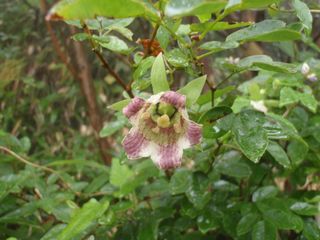 小倉リーダーの「御岳登山」に参加しました。朝から雲行きが怪しくて、何とか雨が降らずにいてくれと願ったが、登山口に着き車から降りたら雨が降りだした。残念、我々九人のうち、二人は登山を諦めた。 雨が降り風が吹いていたが、せっかくここまで来たので御岳の手前にあるテレビ塔まで登る。雨の為か「タカクマ・ホトトギス」の見頃なのに登山客はすくない。少しぬかるんでいて滑りやすところもあった。テレビ塔の隣のピークに登ると「忠六・・・?」と彫られた石碑があった。島津藩・大隅の何某(?)を祀っているのか? 早く下山したので時間があり、「おり」さんの案内で帰り路の近くにある「ダマスクの風(ハーブ園)」に行き、ここで花を眺めながら弁当を食べた。食後に、ここのハーブ茶を飲んだ(恒例のリーダーのコーヒーの替わり?)。 時期がよく、満開のラベンダーの花に幸福を呼ぶと言われている「ブルービー(青色の蜜蜂)」が来て蜜を吸っていた。名前を聞くのも、また姿を見るのも初めてだ。珍しい美しいハチの写真を撮る。「おり」さん有難う!!思い出に残るハチとの出会いであった。まだ時間があったので、鹿屋・垂水の千本イチョウに行き銀杏を拾った。 雨に降られて、御岳のピークを踏めなかったが、満開の「タカクマ・ホトトギス」を見ることができ、また「ブルービー」との出会いなど思い出深い山行でした。リーダーそれに同行の皆様いろいろとお世話になりありがとうございました。また、よろしく!! (1) 登山口 雨降り始め 雨具着る ピークより花 いま盛りなり (2) 秋雨に 濡れて輝く ホトトギス 見る人もなき 花の明りか (3) ラベンダの 妖しく香る 花園に ブルービー飛ぶ 秋の山里 写真:http://www.geocities.jp/chaosmasa/new.html | ||