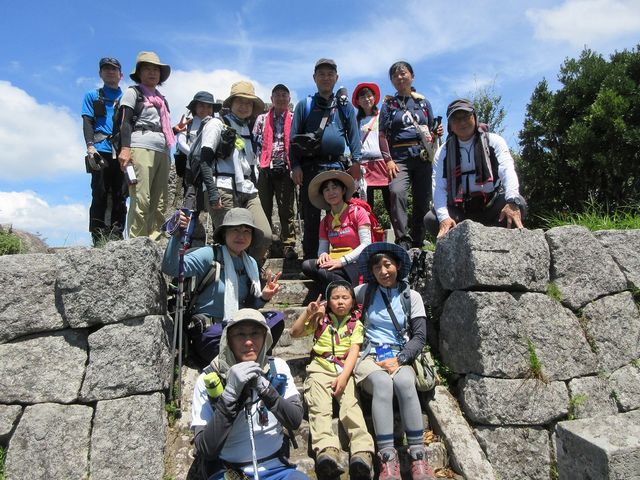 暑かったけれどゆっくりペースだったので、楽しく登れて良かったです。 可愛い大空君に癒され、みんな良い笑顔でしたね! スカッと晴れた夏空と白い雲。北に唐津湾、南に有明海や普賢岳まで見渡せ素晴らしい眺望でした。見帰りの滝へも行けて観光もできて得した気分です。 企画して下さったリーダーの方々、参加の皆様、おかげさまで楽しい一日を過ごすことができました。どうもありがとうございました。 堀内ドライバーさん、今日もバナナの差し入れ、安全運転どうもありがとうございました。 | ||