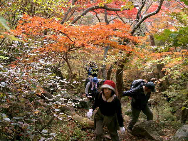 心配していた雨も降らず、頂上から見る山々は赤や黄色に彩られ、頂上に近づくにつれ、落ち葉の色もだんだん赤を増して、まるで赤や黄のトンネルを歩いているみたいでした。遠くの山も近くも全部彩られていて、最高の紅葉狩りでした。さらに、ものすごい岩を見て、あそこを登るのだと聞き、大丈夫かと心配しましたが、なんとか登りその景観に感動しました。リーダーはじめ参加のみなさまありがとうございました。http://blog.goo.ne.jp/tn1124/